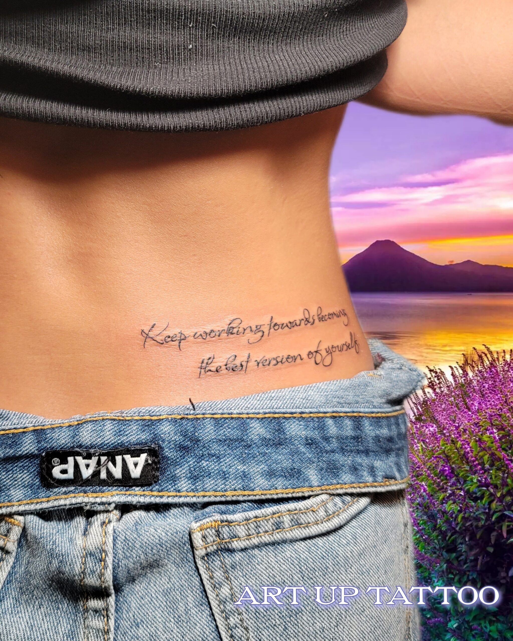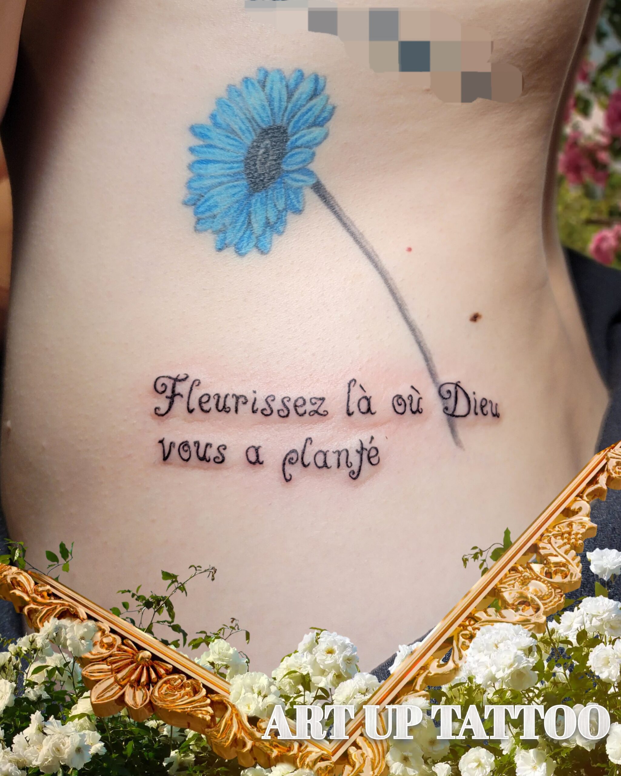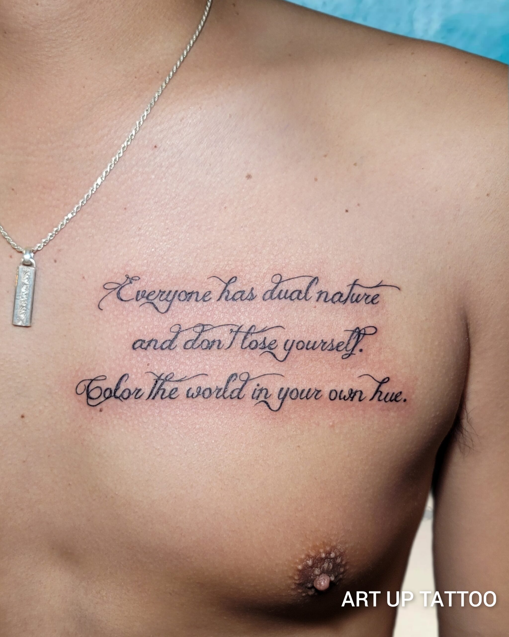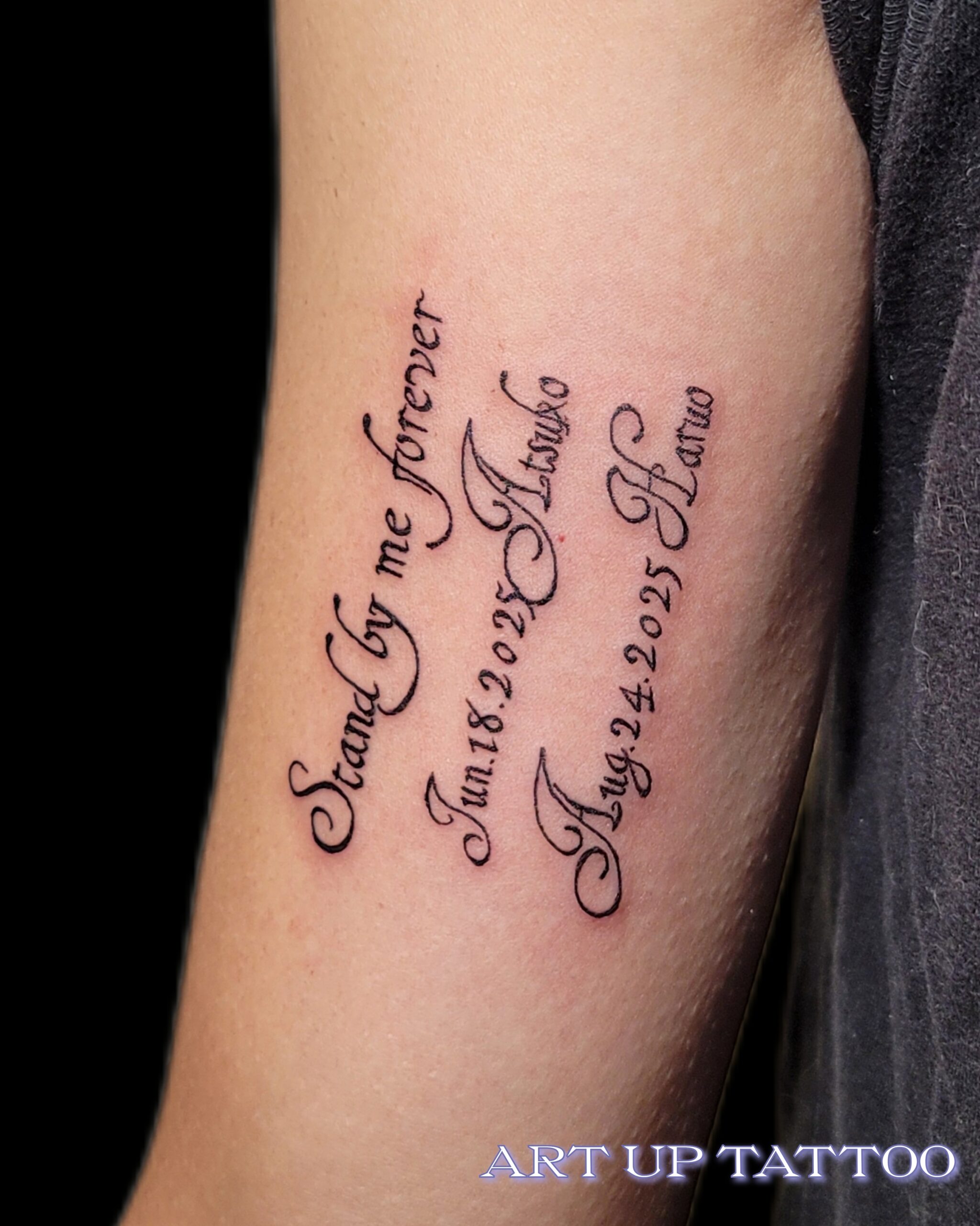 レタリングタトゥーを入れたいけど、どんな文章にすればいいのかわからない。皆さんはどんな文章を入れるのですか?と良く聞かれます。一番多いのは、自分への励ましや目標、家族への想いを綴ったレタリングタトゥーです。単語で一言にまとめるお客様もいらっしゃいます。その次に多いのは、有名人や偉人たちの格言や名言を英文にしたレタリングタトゥーです。レタリングタトゥーに、想いのあるものや花などの挿絵を添えたり、周りをピンスト風のラインで飾ったりするとオリジナリティに富んで他にはない自分だけのタトゥーが完成します。デザインは全てオリジナルの一点物です。入れたいイメージや雰囲気が決まりましたら先ずはカウンセリングにご来店ください。カウンセリングは無料です。