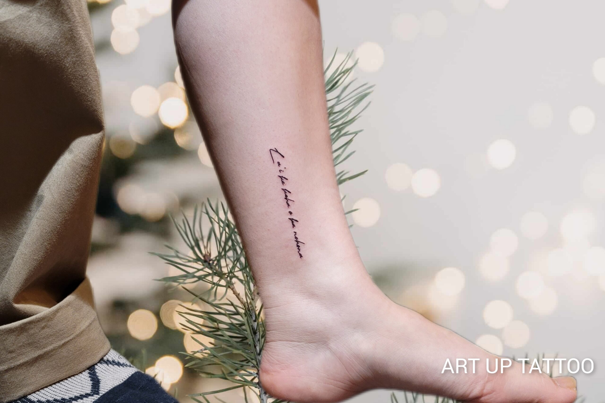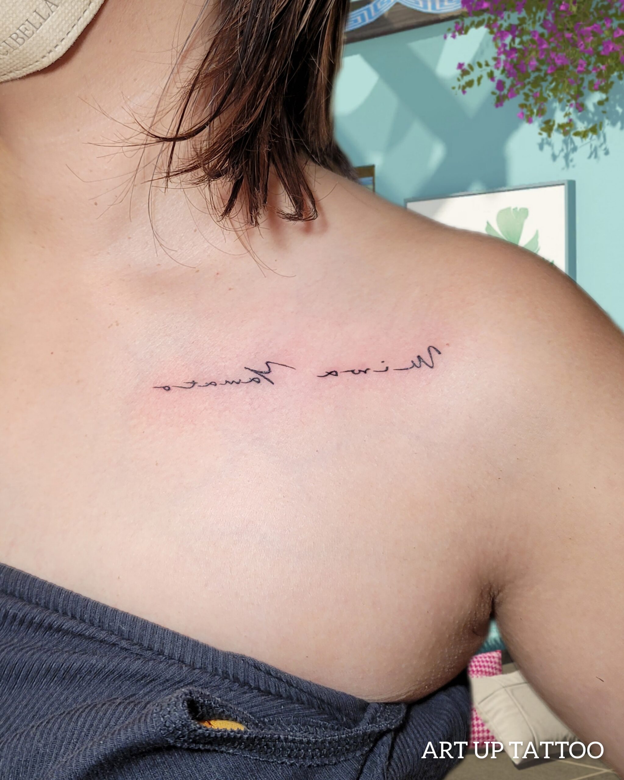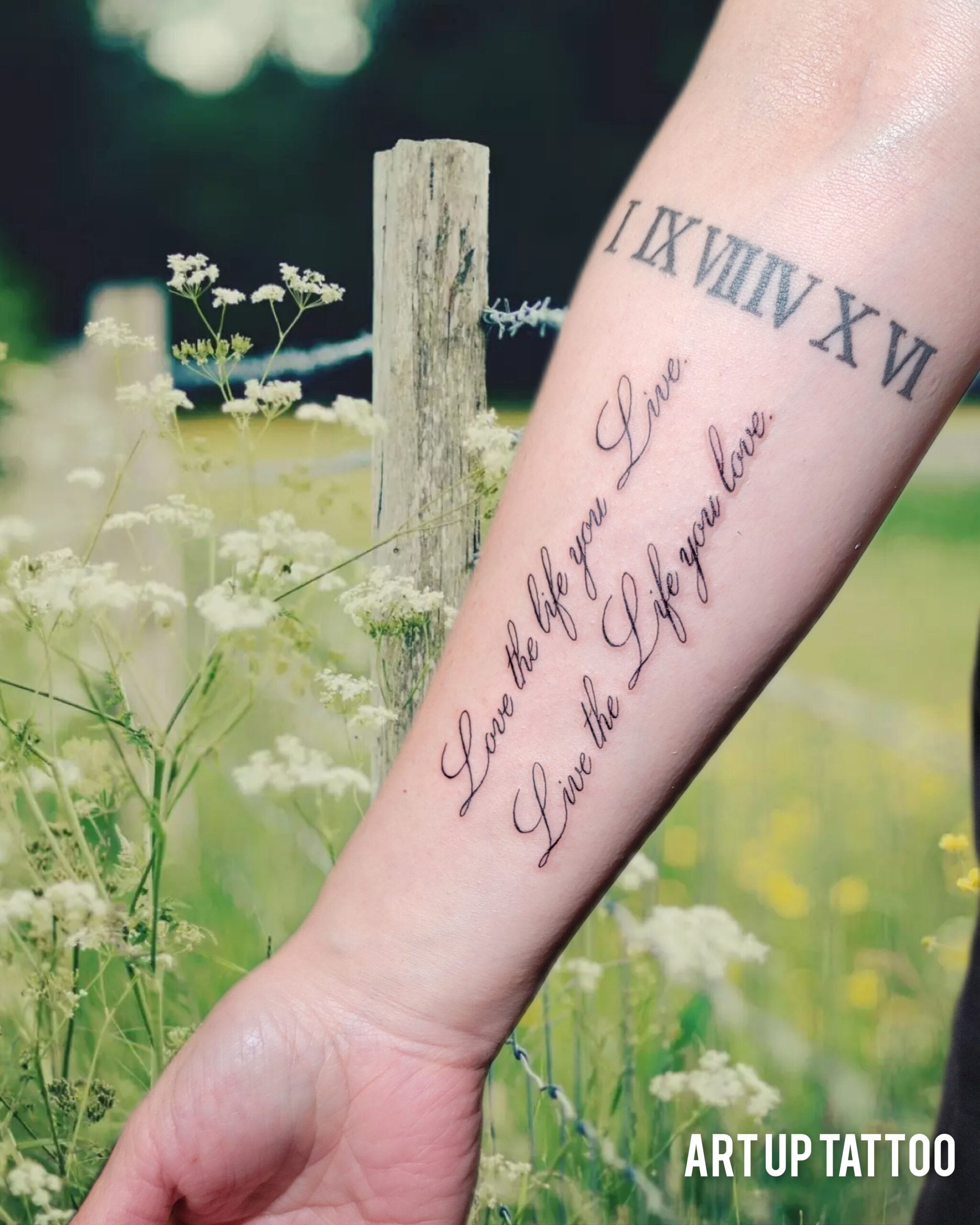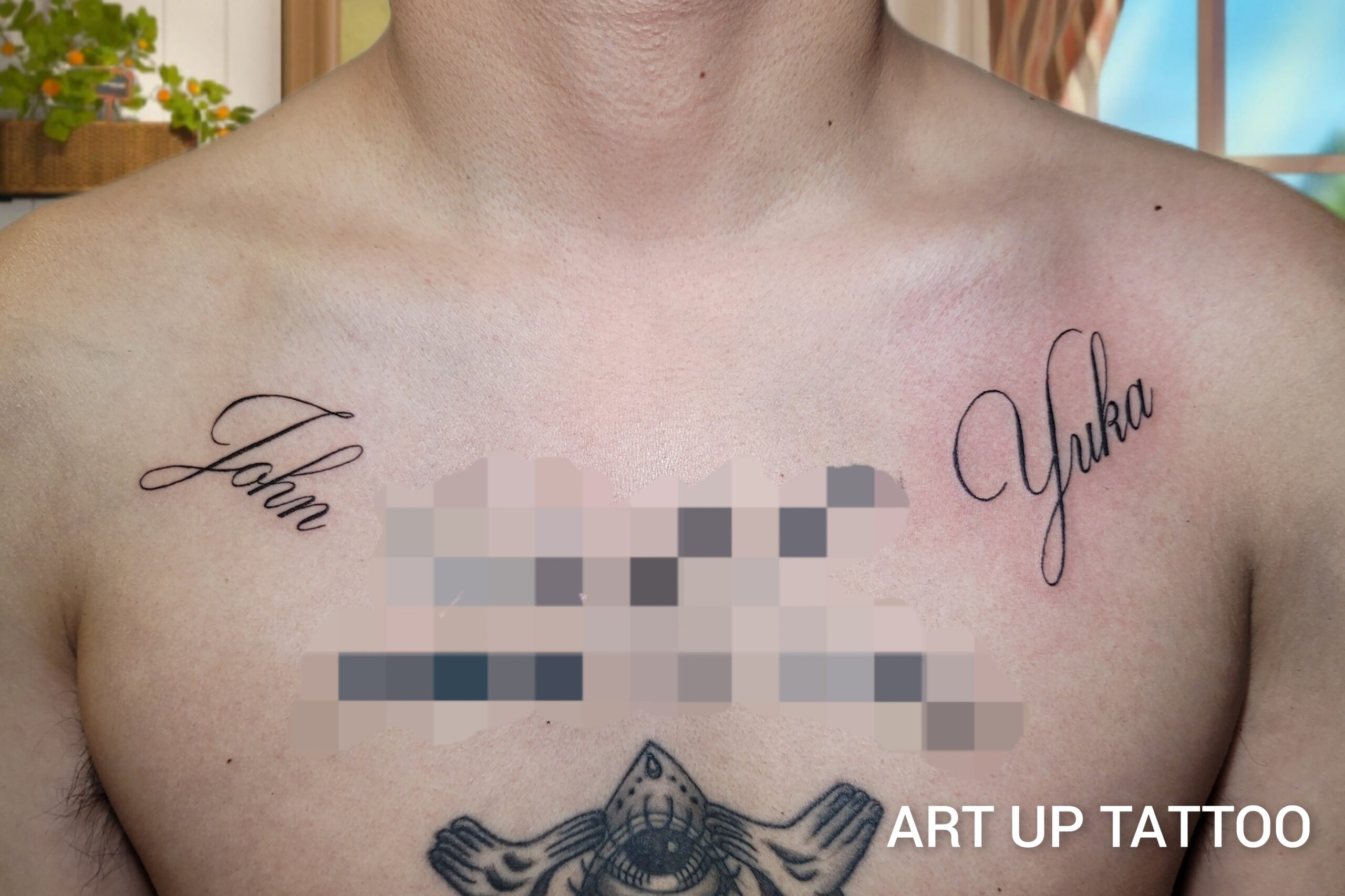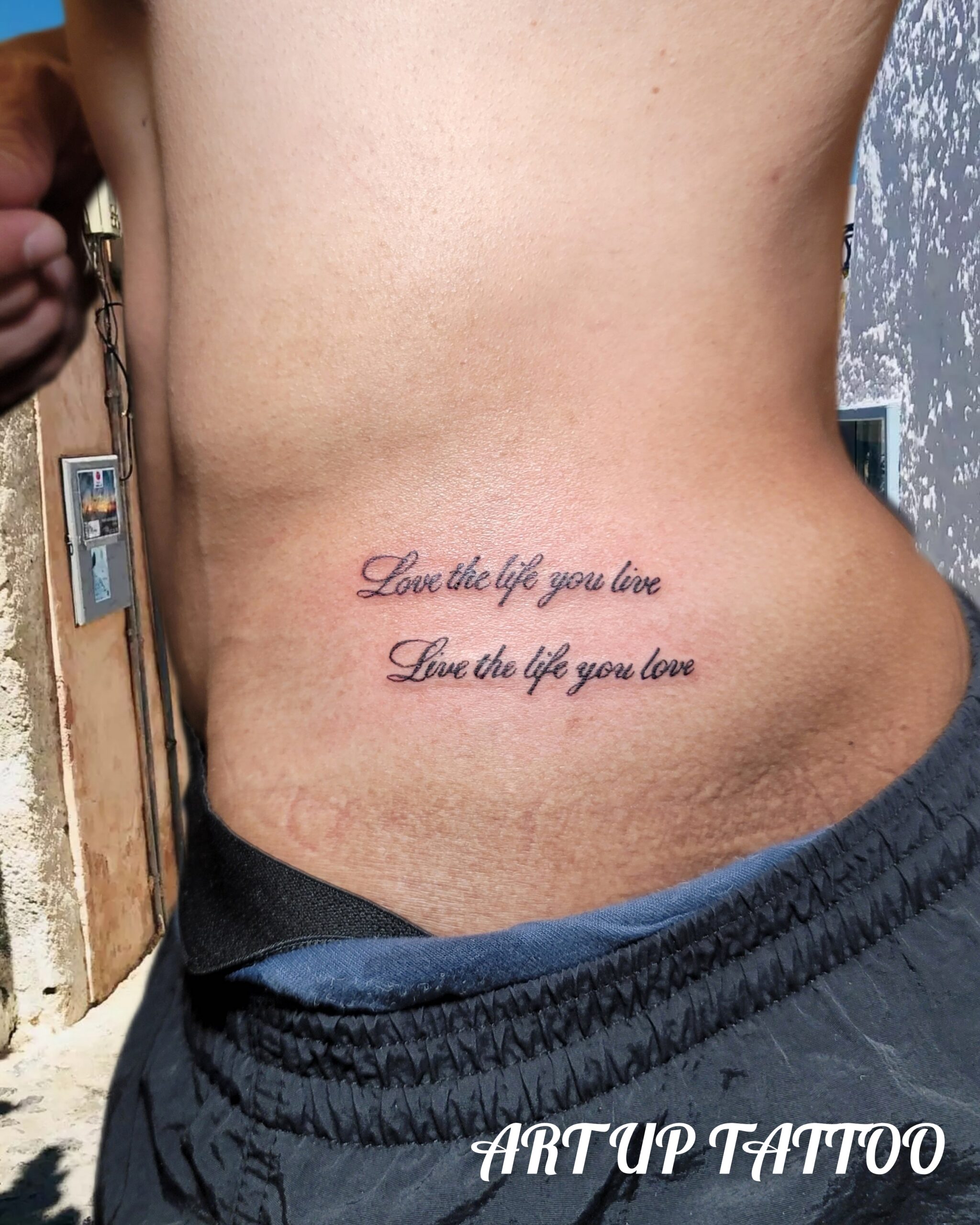 レタリングタトゥーを入れたいけど、どんな文章にすればいいのかわからない。皆さんはどんな文章を入れるのですか?と良く聞かれます。一番多いのは、自分への励ましや目標、家族への想いを綴ったレタリングタトゥーです。単語で一言にまとめるお客様もいらっしゃいます。その次に多いのは、有名人や偉人たちの格言や名言を英文にしたレタリングタトゥーです。レタリングタトゥーに、想いのあるものや花などの挿絵を添えたり、周りをピンスト風のラインで飾ったりするとオリジナリティに富んで他にはない自分だけのタトゥーが完成します。デザインは全てオリジナルの一点物です。入れたいイメージや雰囲気が決まりましたら先ずはカウンセリングにご来店ください。カウンセリングは無料です。